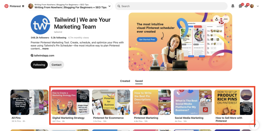 Keywords are also used to optimize boards, so you should include keywords organically in board names and descriptions. Here’s an example from Pinterest marketing company Tailwind—notice that all the board names have keywords related to their content.